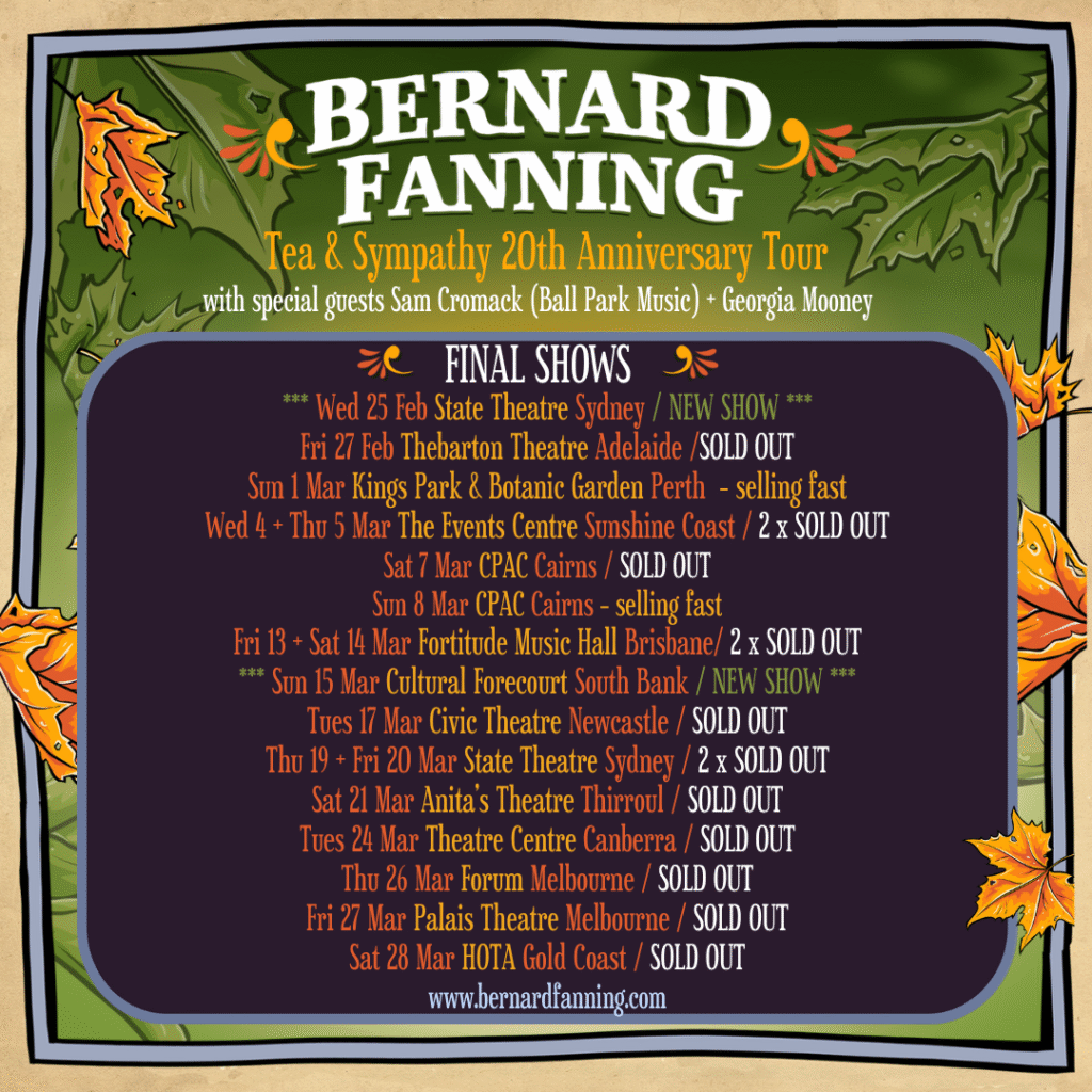 BERNARD FANNING ANNOUNCES 3RD & FINAL TEA & SYMPATHY 20TH ANNIVERSARY TOUR SHOWS